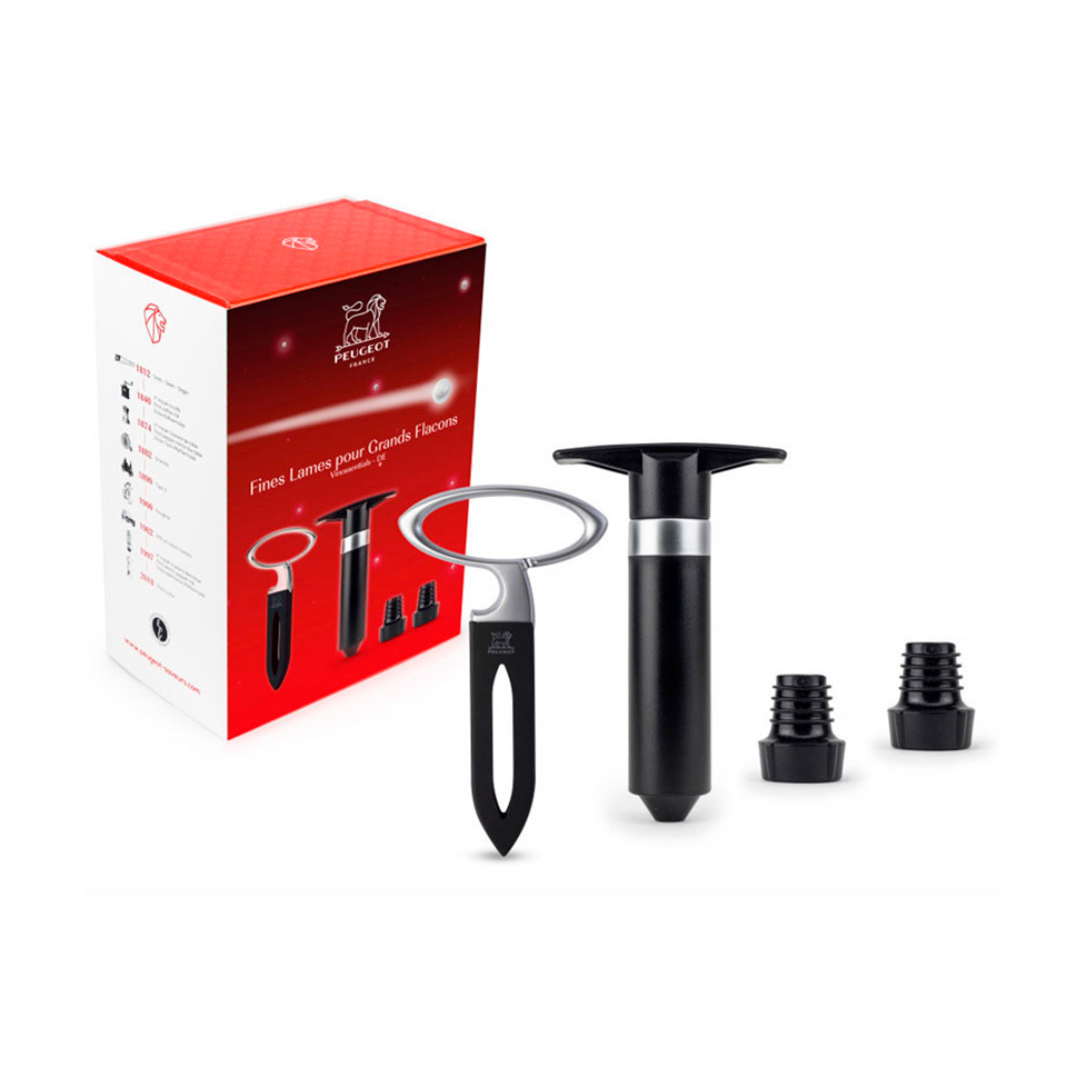 Набор состоит из универсального Штопора для хрупких пробок и вакуумного насоса для вина + 2 пробки История возникновения Peugeot зародилась в начале 19-го века. А именно в 1810-ом году, когда братья Peugeot решили переделать мельницу, которая им досталась от родителей, в сталеплавильное предприятие. Так братья наладили производство, выпускающее самые разные изделия из стали, необходимые в повседневном быту и хозяйстве. Спустя много лет, с наступлением новой эры технологических инноваций и современных материалов, компания Peugeot решает сменить прежнюю продукцию на более востребованный ассортимент. Так с 2008-го года компания запускает новую линию аксессуаров для винных напитков. На данный момент количество винных аксессуаров, выпускаемых под торговой маркой Peugeot, достаточно велико и классифицируется на несколько групп: Инструменты, необходимые для откупоривания, сервиса и консервации винных бутылок, подаваемых на стол; Продукция, необходимая для полного раскрытия вкуса и аромата вин; Посуда, предназначенная для дегустации винных напитков и многое другое. Как известно, все мы имеем индивидуальные предпочтения в еде и напитках. Ни одно застолье не обходится без вкусных блюд, безалкогольных и спиртных напитков, среди которых обязательно должна быть бутылочка хорошего вина. Однако не всем известно, что этот вкуснейший напиток требует особого отношения и даже существует специальный этикет, как правильно открывать, куда и как наливать, а также с какими блюдами подавать тот или иной сорт вина. Разобраться в этих тонкостях поможет Peugeot со своей изумительной коллекцией аксессуаров.